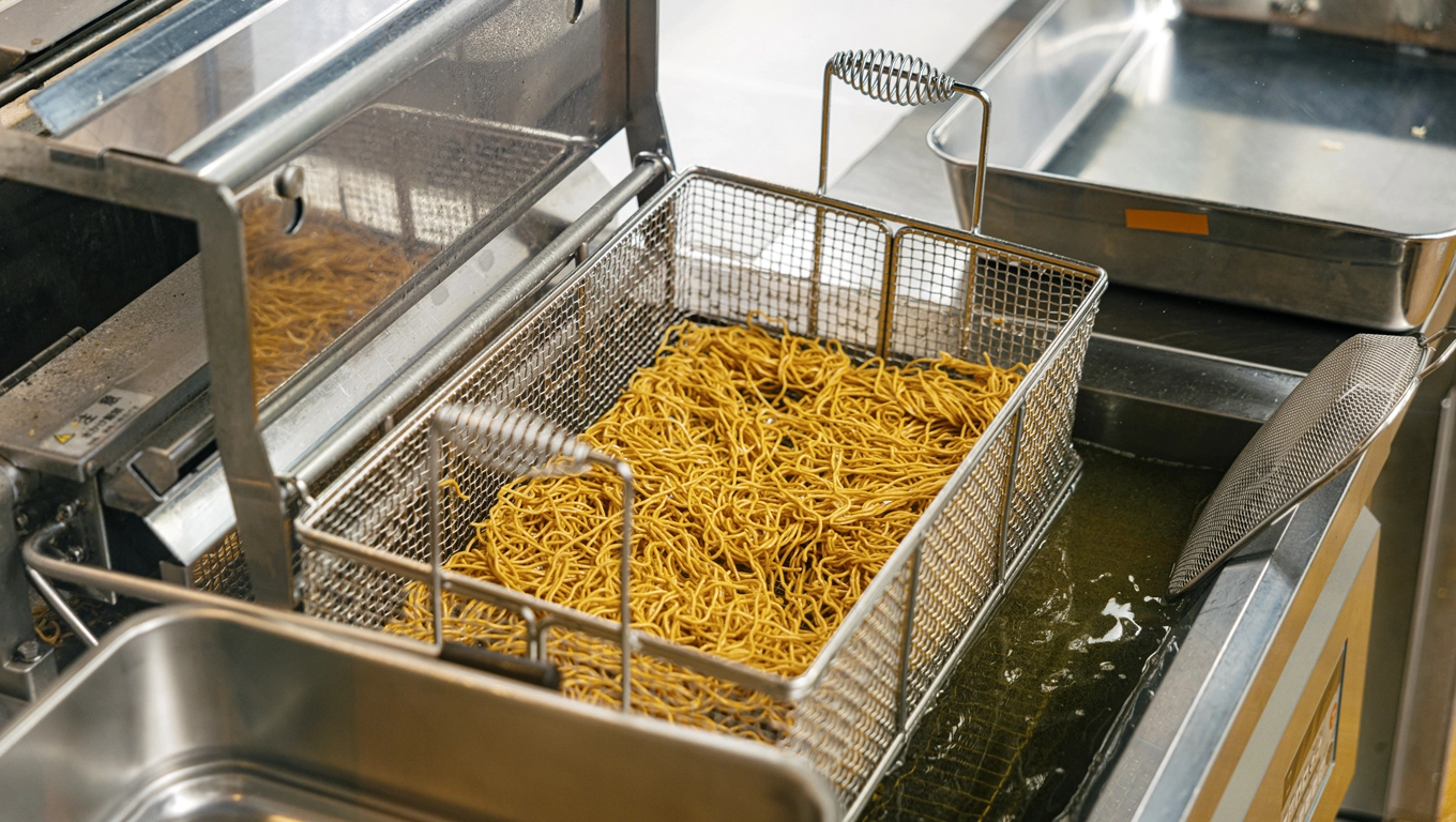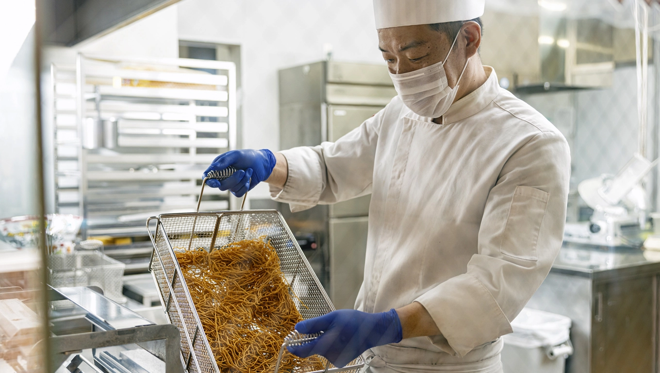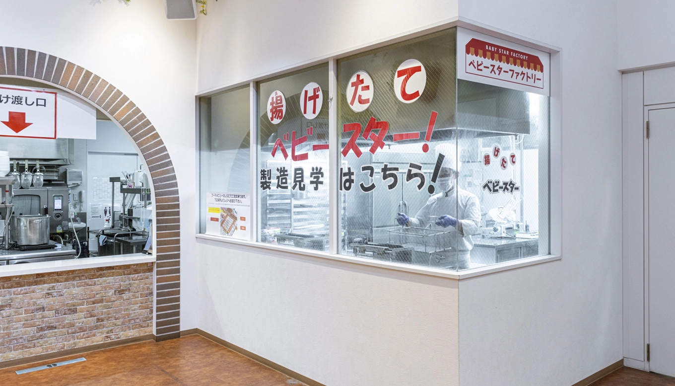 ベビースターラーメンがどうやって作られているのか、間近で見てみよう! 目の前で揚げられるベビースターラーメンは迫力満点! 園内では、揚げたてプレミアムベビースターも販売しているよ!